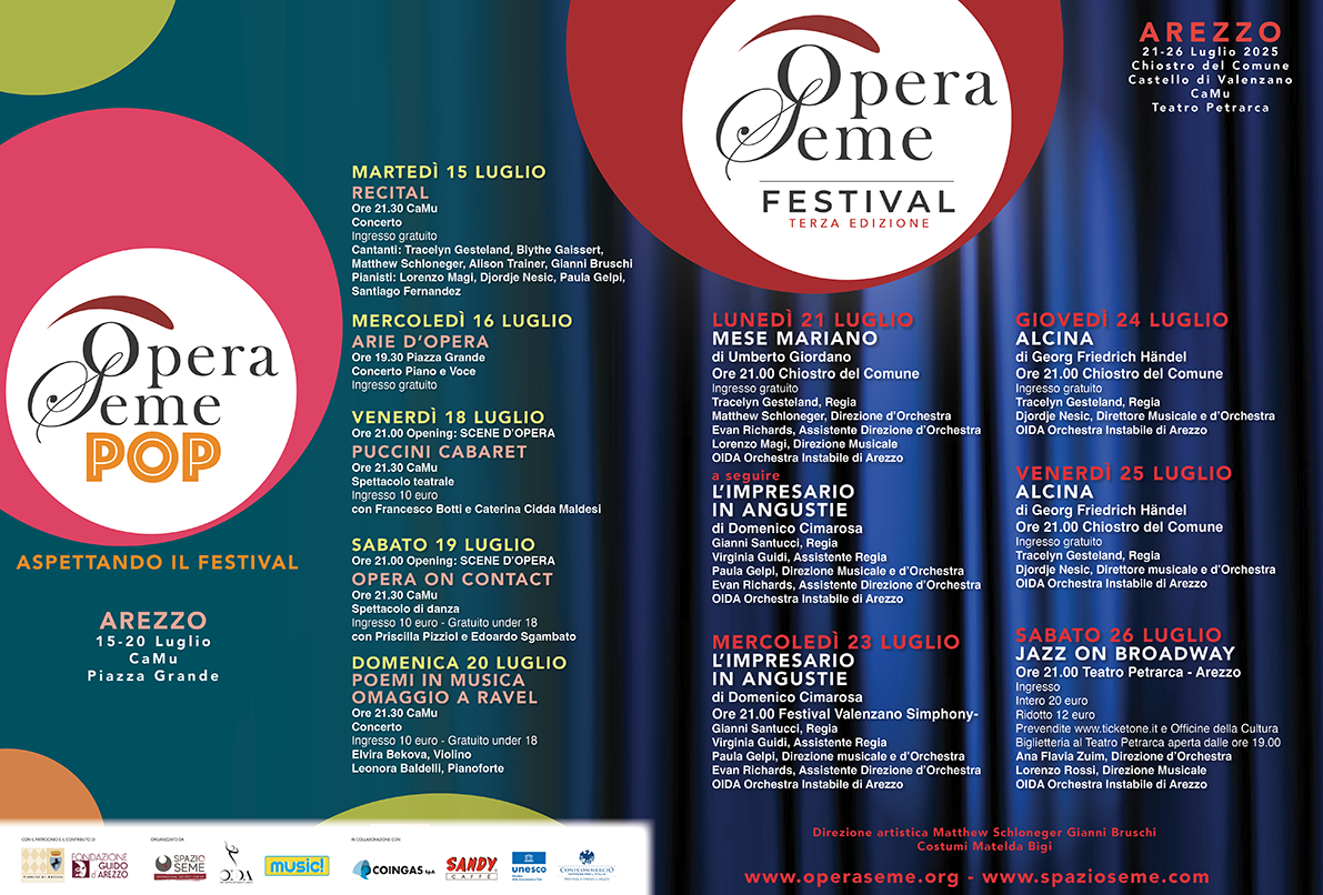 Opera Seme Festival è organizzato da Spazio Seme Centro Internazionale con OIDA – Orchestra Instabile Di Arezzo, Opera Seme con il patrocinio del Comune di Arezzo e della Fondazione Guido d’Arezzo, con la collaborazione di Associazione Music, Festival Musicale Valenzano Symphony e il contributo di @Coingas, sandy caffè e Confcommercio FiAr – Arezzo.